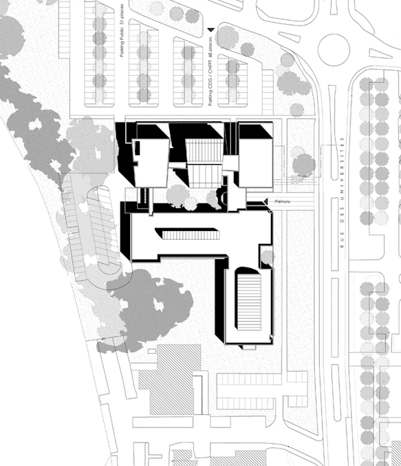Des aménagements paysagés et piétonniers offrent aux usagers un espace extérieur protégé privilégié. La nouvelle entrée profite de la transparence sur le jardin intérieur et d’un retrait sur la façade est pour imposer sa présence depuis la rue des Universités.