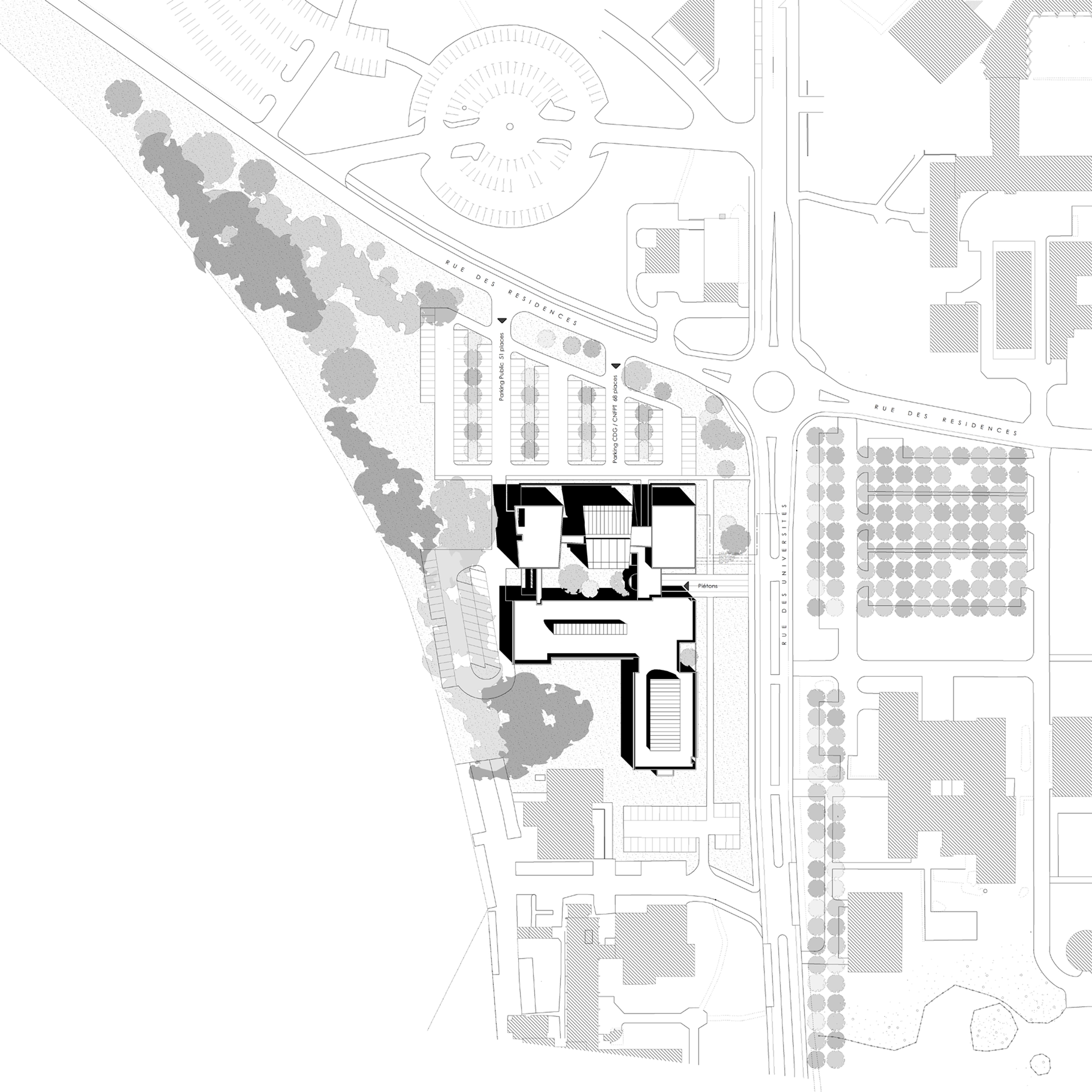Les trois plots proposés utilisent un langage volumétrique différent de l’équerre du bâtiment existant. L’implantation de l’extension profite de la contiguïté avec le C N FPT pour renforcer les liens fonctionnels, piétonniers et visuels et réalise ainsi une véritable entité autour du jardin.