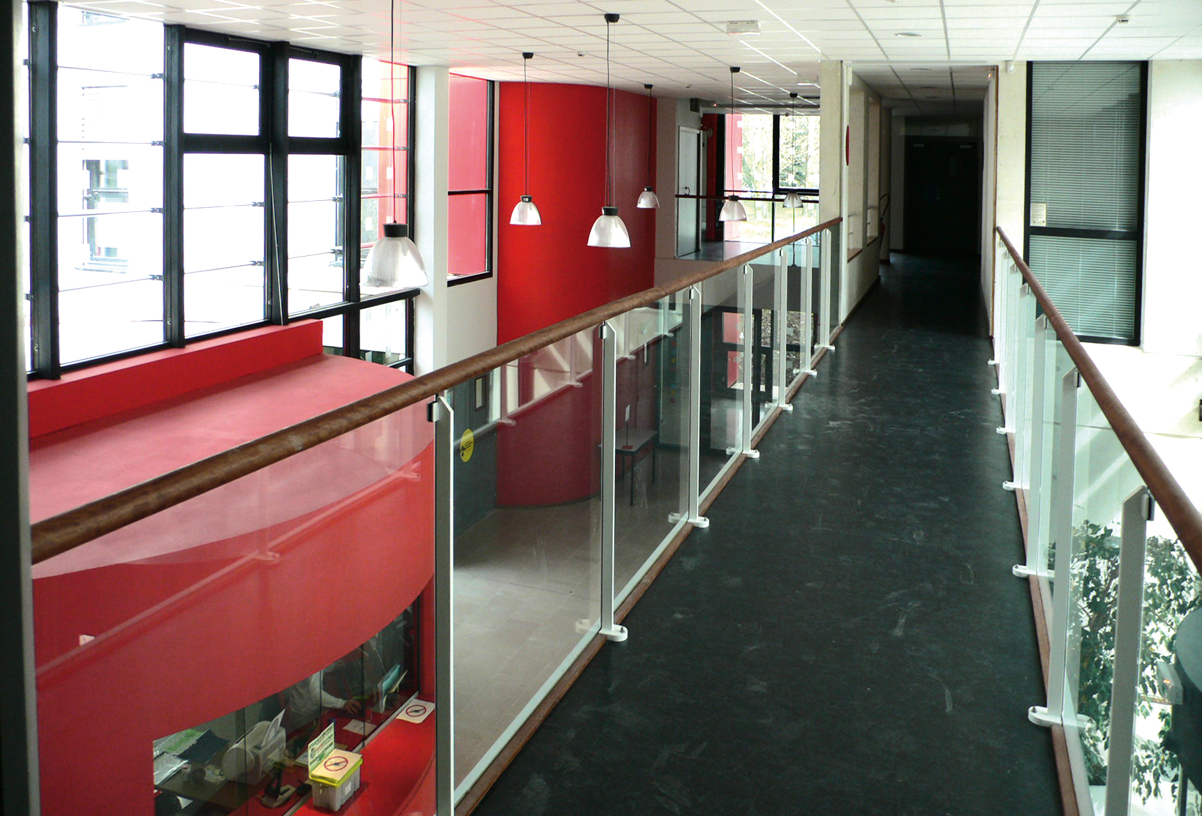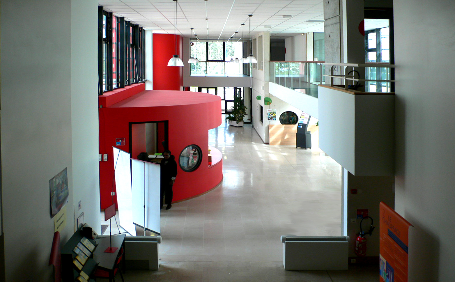 A l’articulation des façades nord et est, le pôle commun, point de jonction entre le C N FPT et le CDG, affiche la particularité de sa fonction. La documentation au rez-de-chaussée et l’attique du niveau 2 s’ouvrent largement sur la rue.