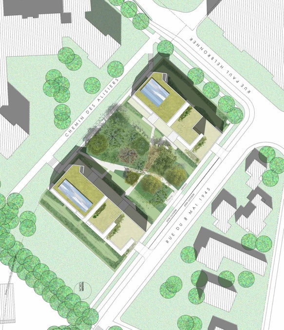 L'architecture de l'ensemble se veut pérenne, lisible et sereine. La modénature des façades exprime l’évidence d’une ouverture vers le sud-ouest en direction du parc Jean Verlhac et vers le sud-est et la rue du 8 mai 45, alors que s’expriment au nord-ouest et nord-est des façades, protectrices, lisses et pleines. Les pignons bas sur l’avenue du 8 mai 45, à l’interface d’une zone presque pavillonnaire, scandent la rue du 8 mai 1945 et laissent percevoir l’épannelage progressif du bâti et la présence centrale de la micro-forêt qui profite ainsi à tous.