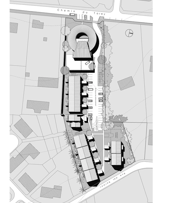 Le bâtiment gendarmerie s’implante au plus près du chemin du Torey, dans la limite des contraintes du programme.