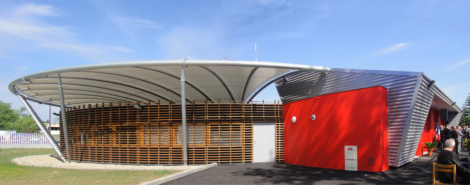 La forme et la texture du bâtiment de la gendarmerie sont simples et fortement identifiables. Le plan circulaire et la recherche d’uniformité de la texture de la façade sont les deux principaux arguments permettant de ne pas le confondre avec les constructions voisines.