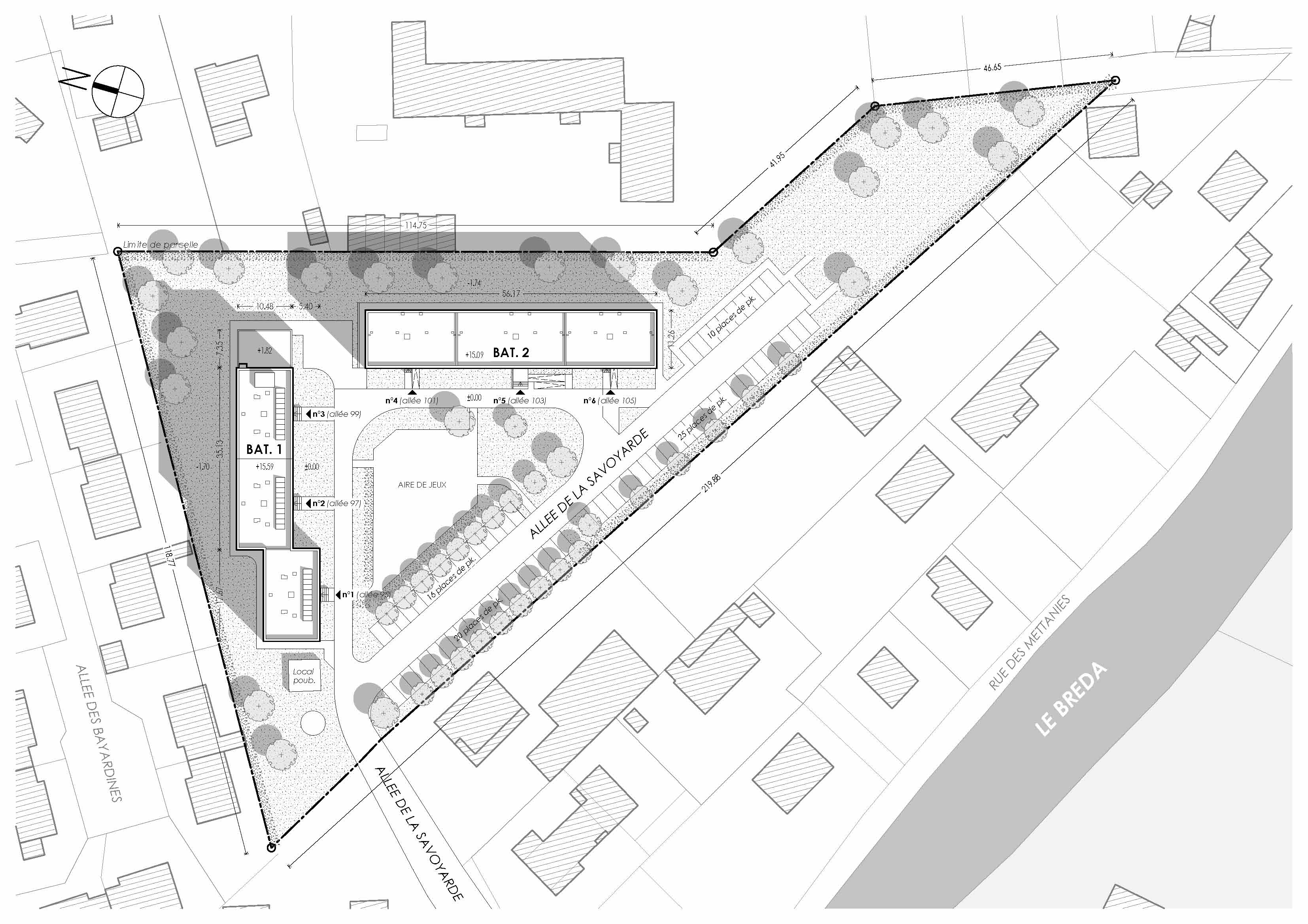 Construit à la fin des années 1960, cet ensemble d’habitat social est constitué de deux bâtiments. Chaque bâtiment comprend trente logements et bénéficie d’une typologie allant du T1 au T5 avec un sous- sol semi-enterré et cinq niveaux d’habitations.