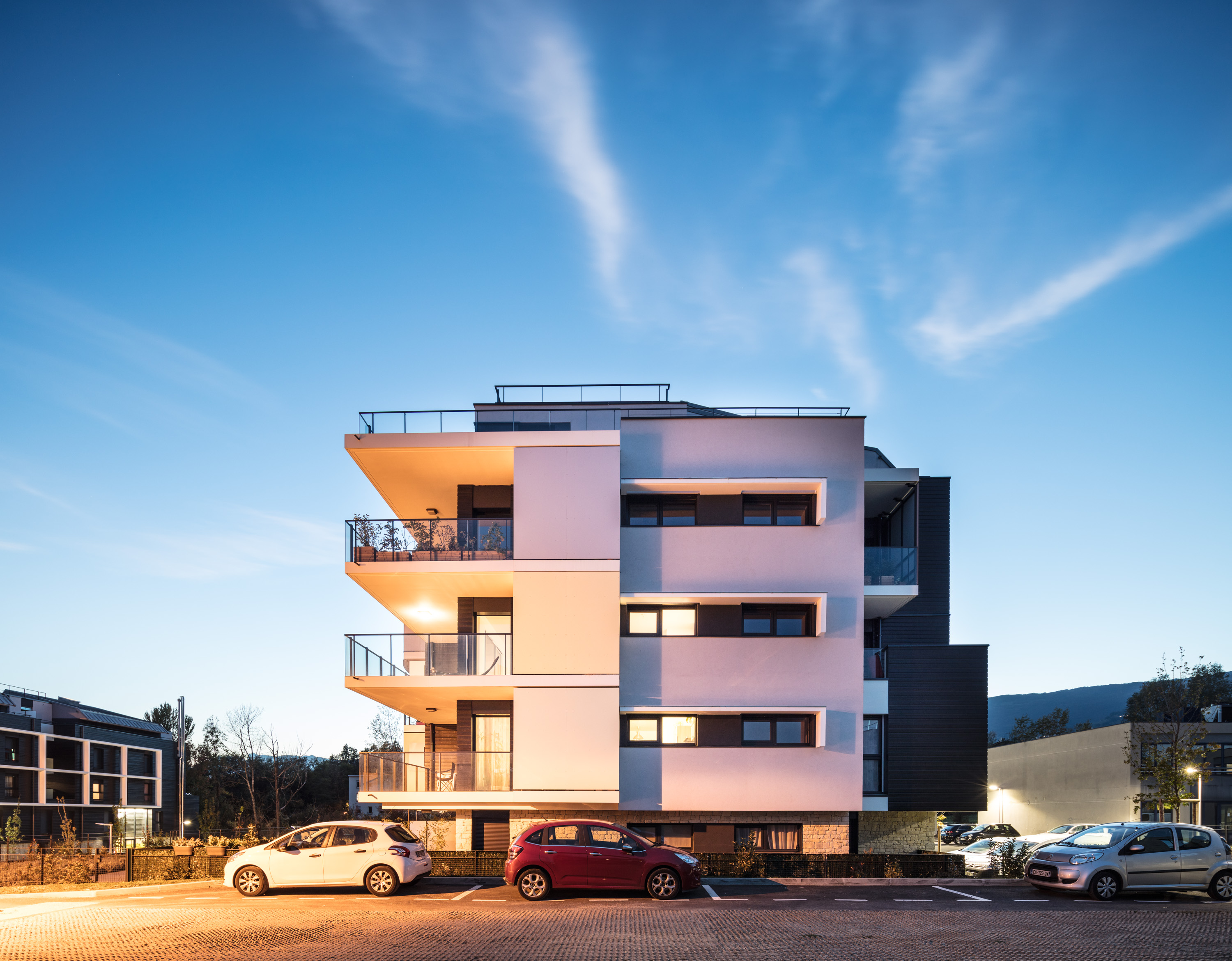 Les logements sont répartis en deux bâtiments parallèles accompagnés de leurs parkings, bénéficiant de deux accès distincts depuis le chemin de la Dhuy, implantés suivant la topographie du site et occupant le terrain sur sa largeur.