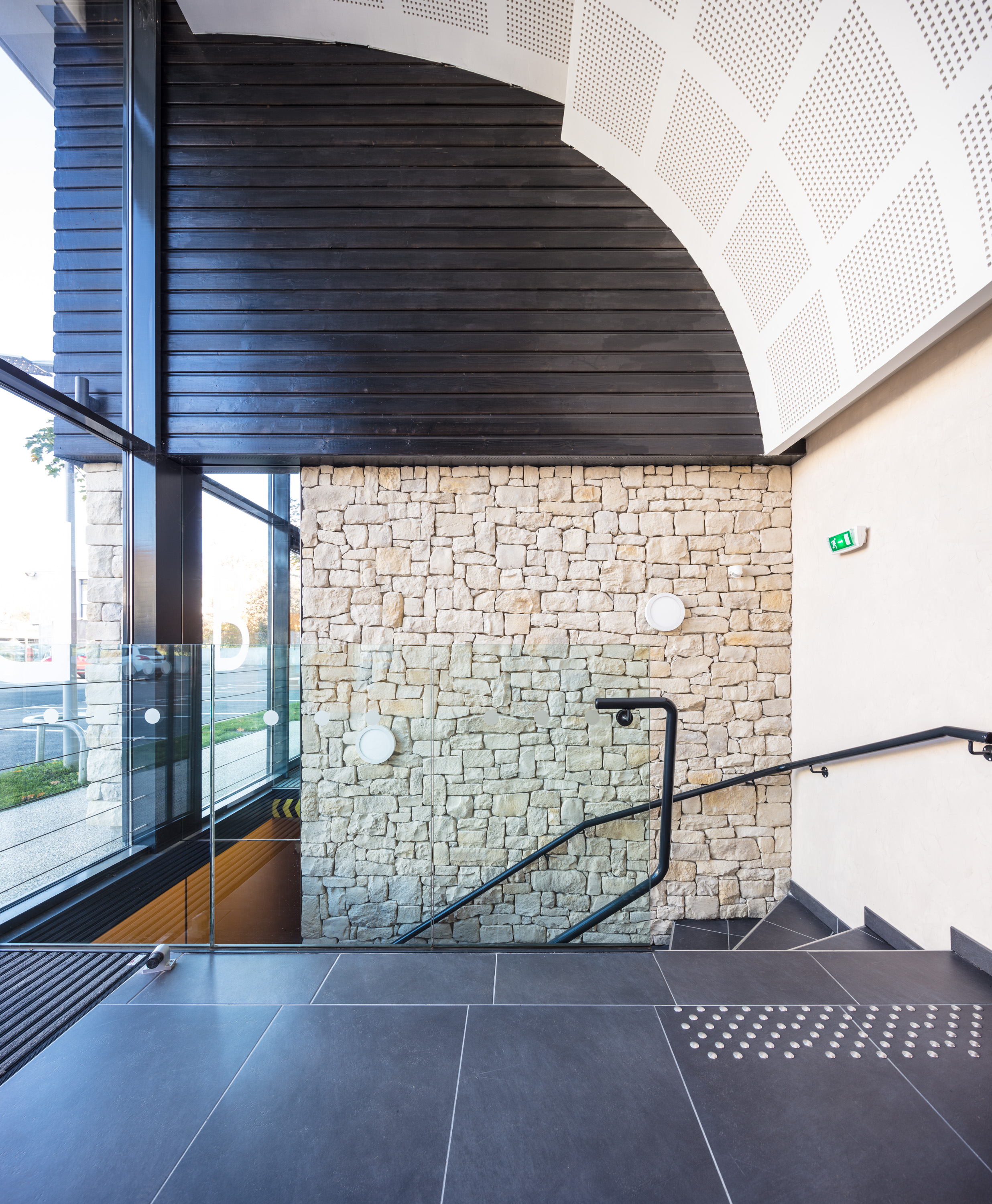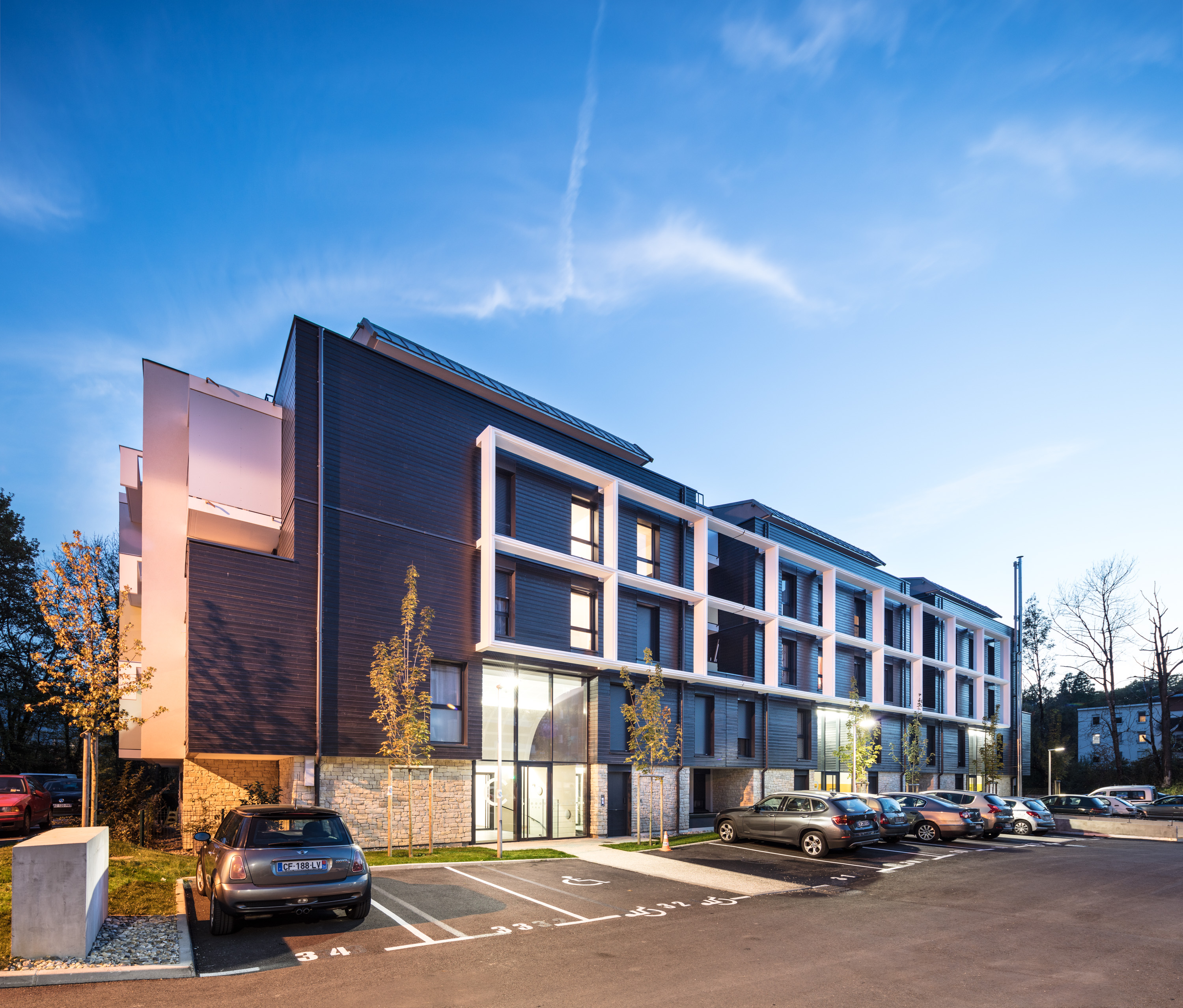 L’architecture de l’ensemble est simple et recherche l’élégance : simplicité et régularité des volumes et des percements, prédominance de l’horizontale des balcons filants laqués de blanc, ponctués localement de pleins colorés de teintes pastelles en contraste fort des façades bardées de bois de teinte sombre ; enduit de teinte claire des façades latérales en contraste des bardages et du socle minéral.