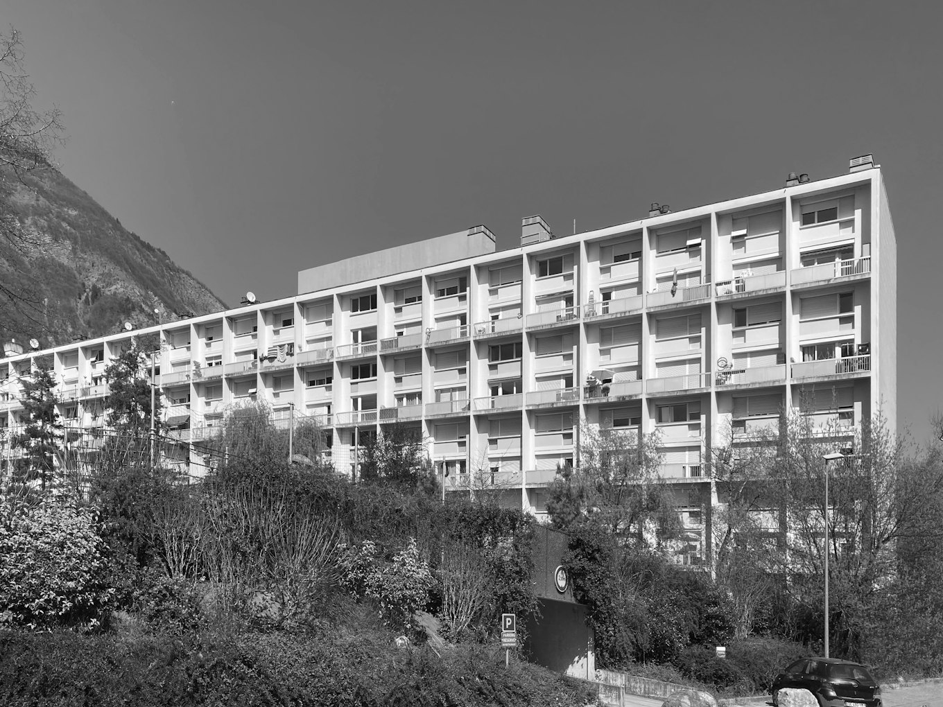 La parcelle, située à proximité de l’Isère au Sud, est séparée du CHU de Grenoble par un quartier pavillonnaire à l’Est. Le site comporte aujourd’hui un ensemble de deux constructions conçues au début des années 60 par les architectes Novarina – Welti – Rubinstein : Une tour circulaire et un bâtiment de 121 logements sociaux.