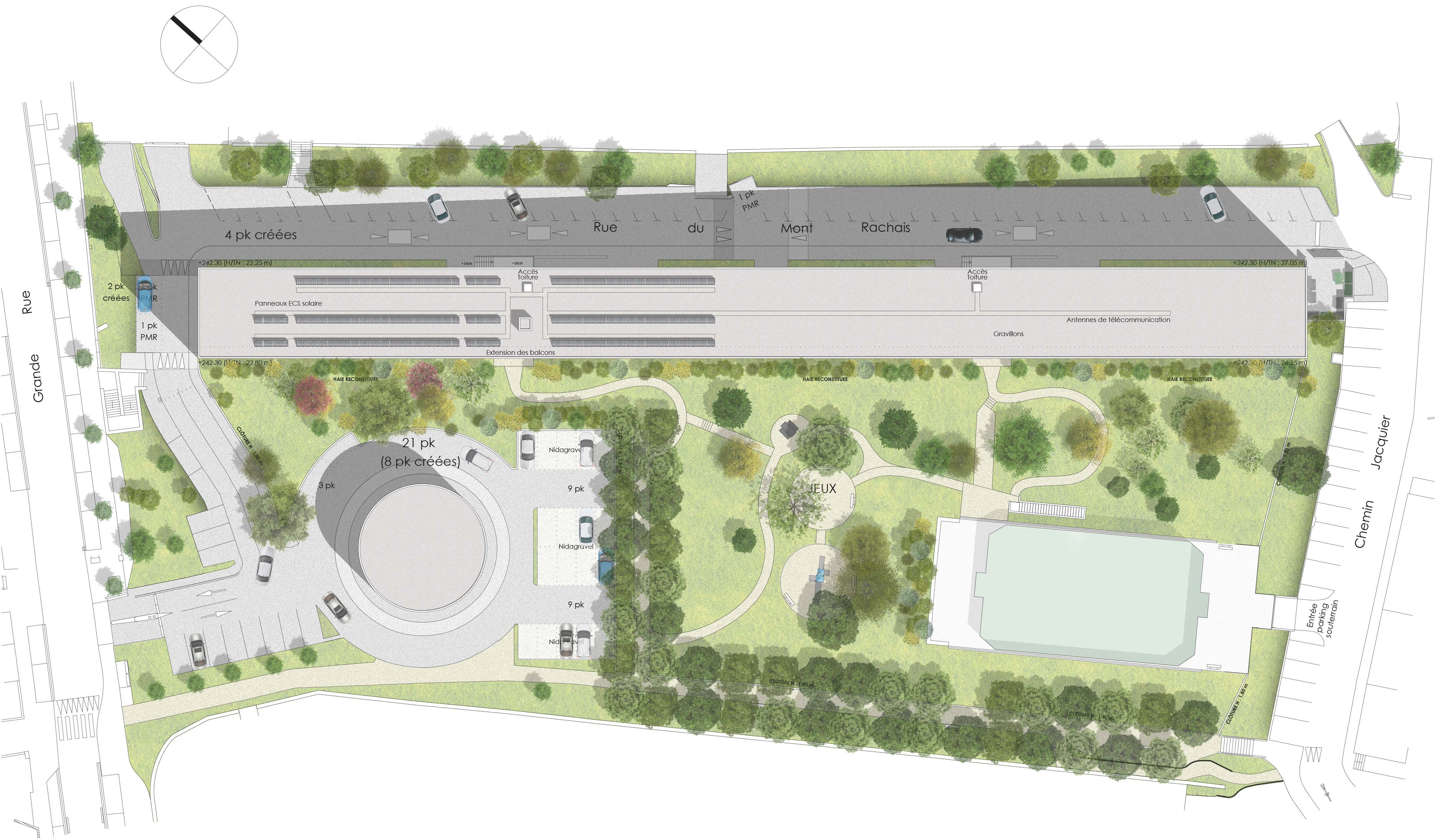 L’ouvrage est érigé au sein d’un parc arboré orienté vers le Sud et l’Ouest. Il comprend des cheminements, un terrain multisport et des aires de jeux pour enfants.