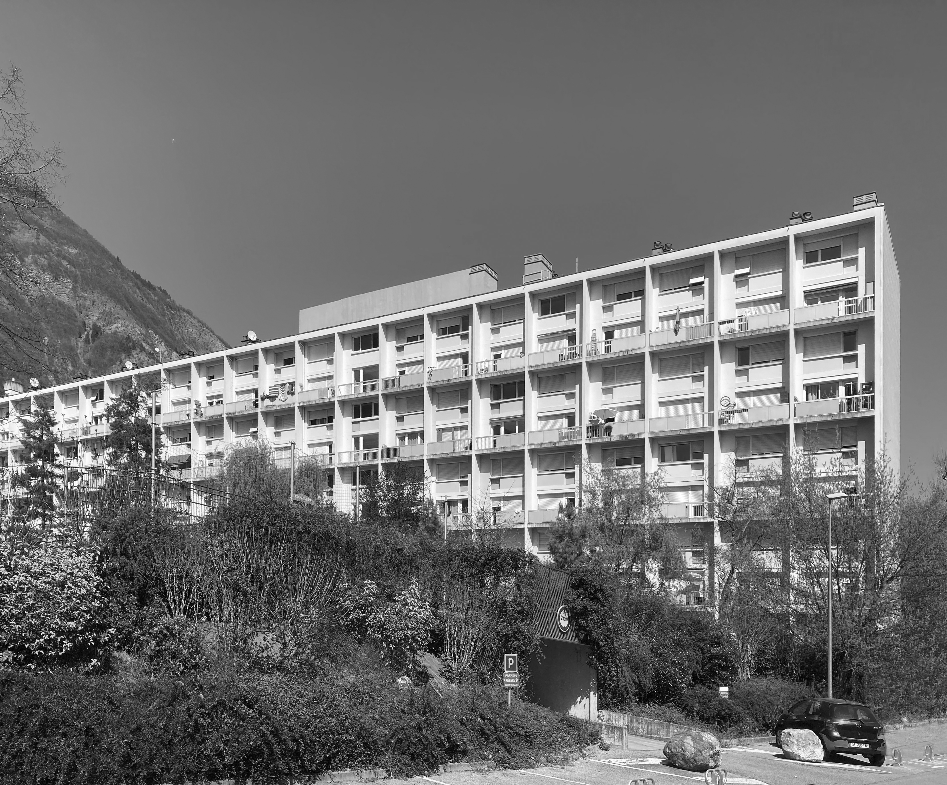 La parcelle, située à proximité de l’Isère au Sud, est séparée du CHU de Grenoble par un quartier pavillonnaire à l’Est. Le site comporte aujourd’hui un ensemble de deux constructions conçues au début des années 60 par les architectes Novarina – Welti – Rubinstein : Une tour circulaire et un bâtiment de 121 logements sociaux.
