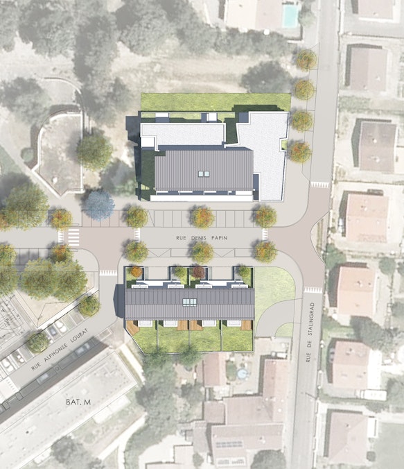 L’ilot nord s’inscrit au centre de tènements appartenant à la ville, sur les rues Denis Papin et Stalingrad au sud. Ses autres limites sont végétalisées sur les autres limites. Le projet de logements collectifs pour Foncière restera donc « autonome », sans autre construction en mitoyenneté.