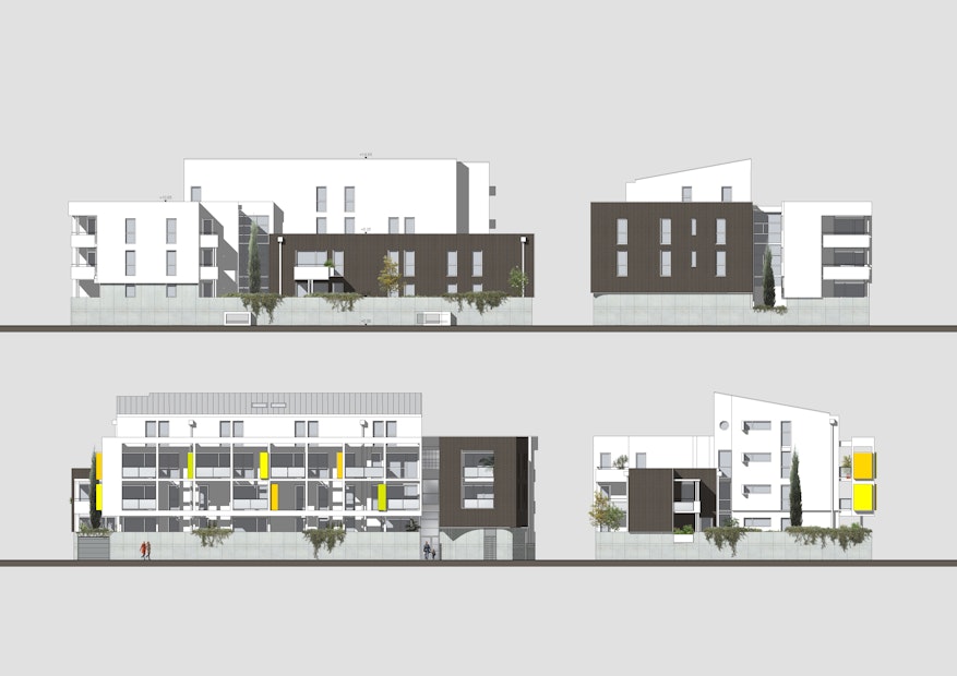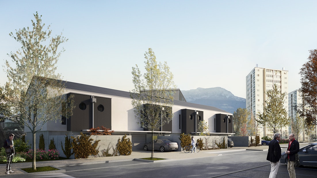 Ce projet de 223 logements se situe à l’articulation du village ancien d’Echirolles et de la « ville nouvelle » construite dans les années 1968, nommée « Village II » avec, d’un côté, le profil de la rue de Stalingrad avec ses maisons individuelles en R+1 ou 2 étages, toitures à 2 pans, avec des jardins clos, bordés de murs maçonnés et, de l’autre, de grands ensembles, barres d’immeubles et tours de R+4 à R+13.