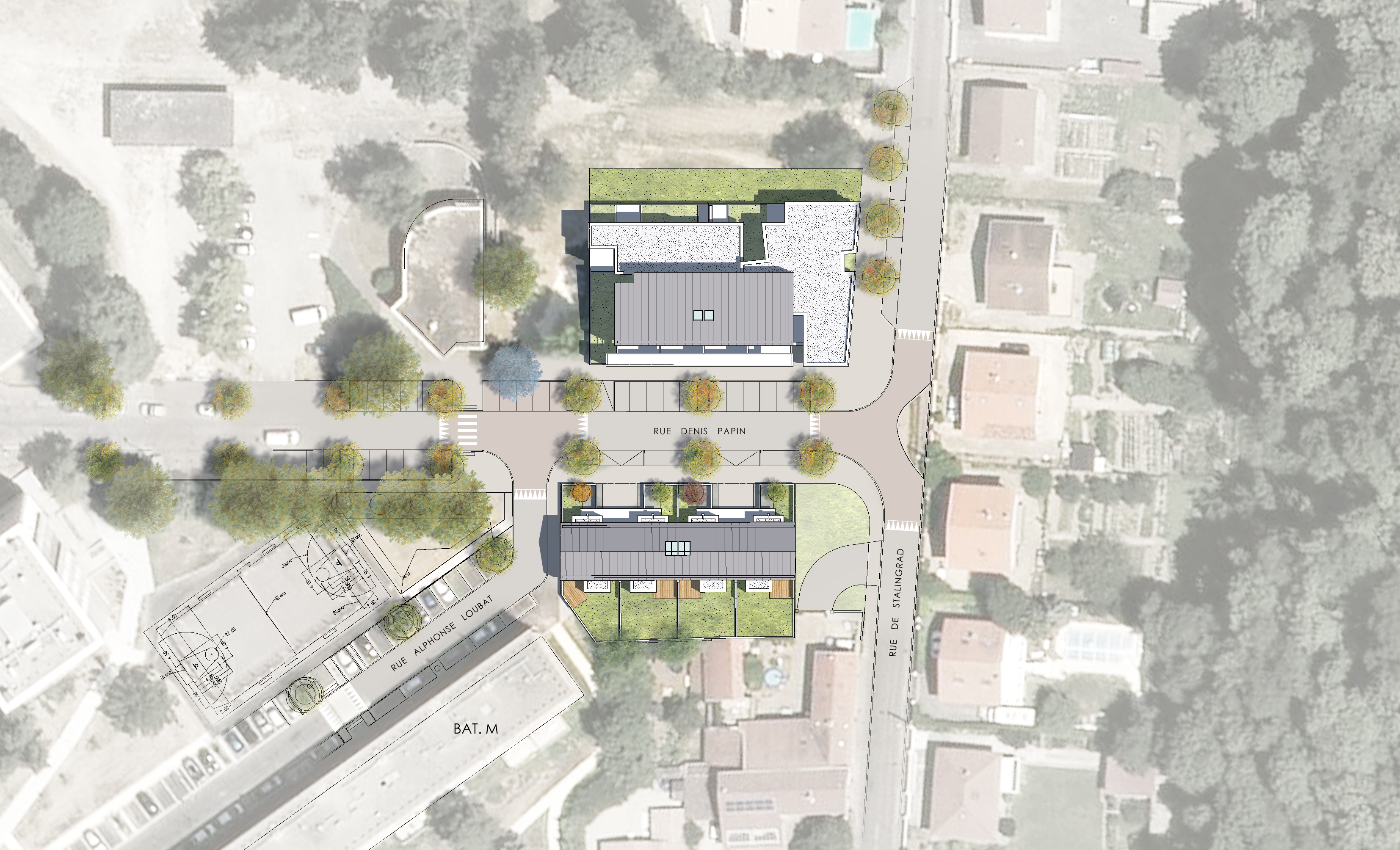 L’ilot nord s’inscrit au centre de tènements appartenant à la ville, sur les rues Denis Papin et Stalingrad au sud. Ses autres limites sont végétalisées sur les autres limites. Le projet de logements collectifs pour Foncière restera donc « autonome », sans autre construction en mitoyenneté.