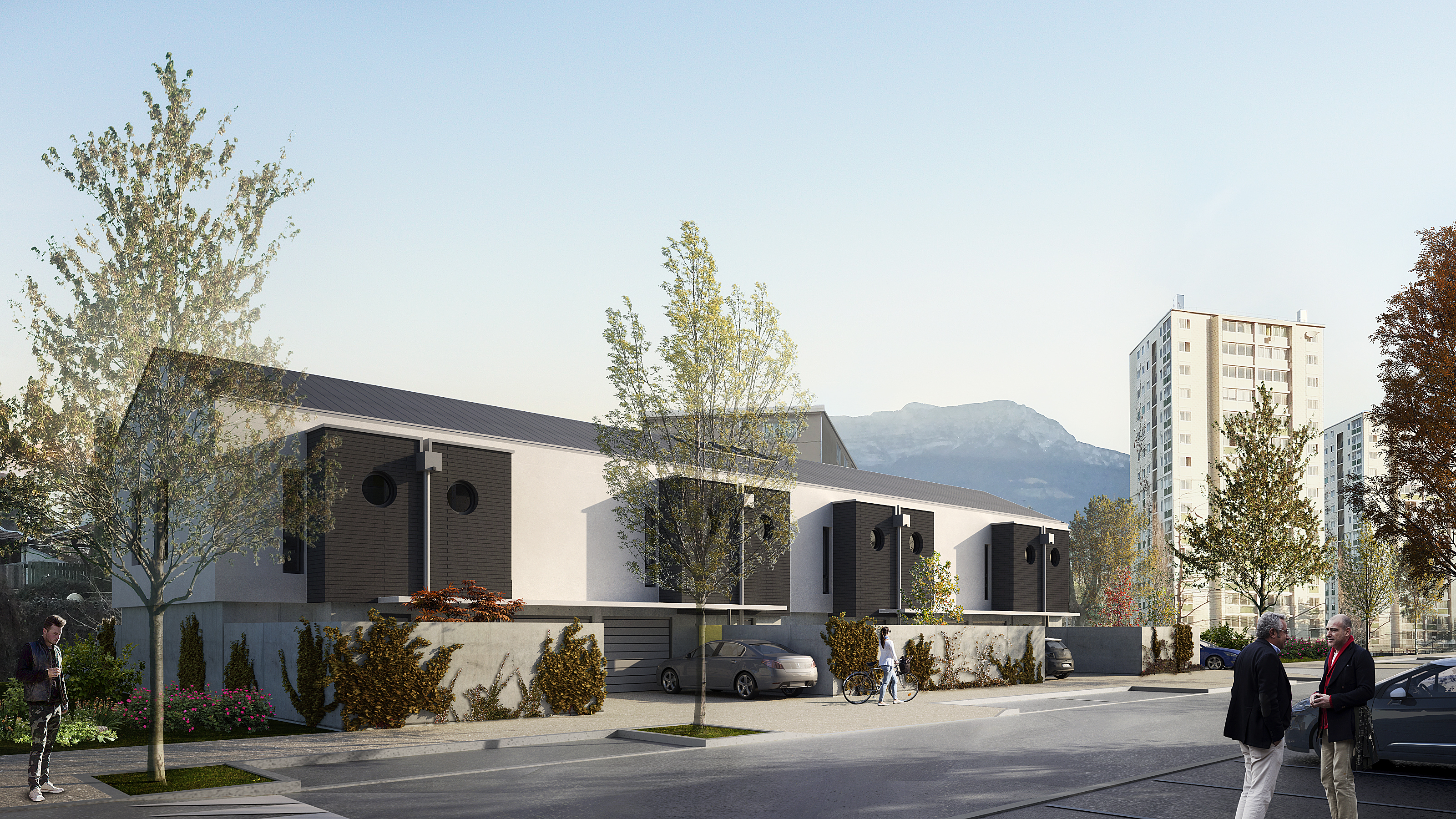 Ce projet de 223 logements se situe à l’articulation du village ancien d’Echirolles et de la « ville nouvelle » construite dans les années 1968, nommée « Village II » avec, d’un côté, le profil de la rue de Stalingrad avec ses maisons individuelles en R+1 ou 2 étages, toitures à 2 pans, avec des jardins clos, bordés de murs maçonnés et, de l’autre, de grands ensembles, barres d’immeubles et tours de R+4 à R+13.